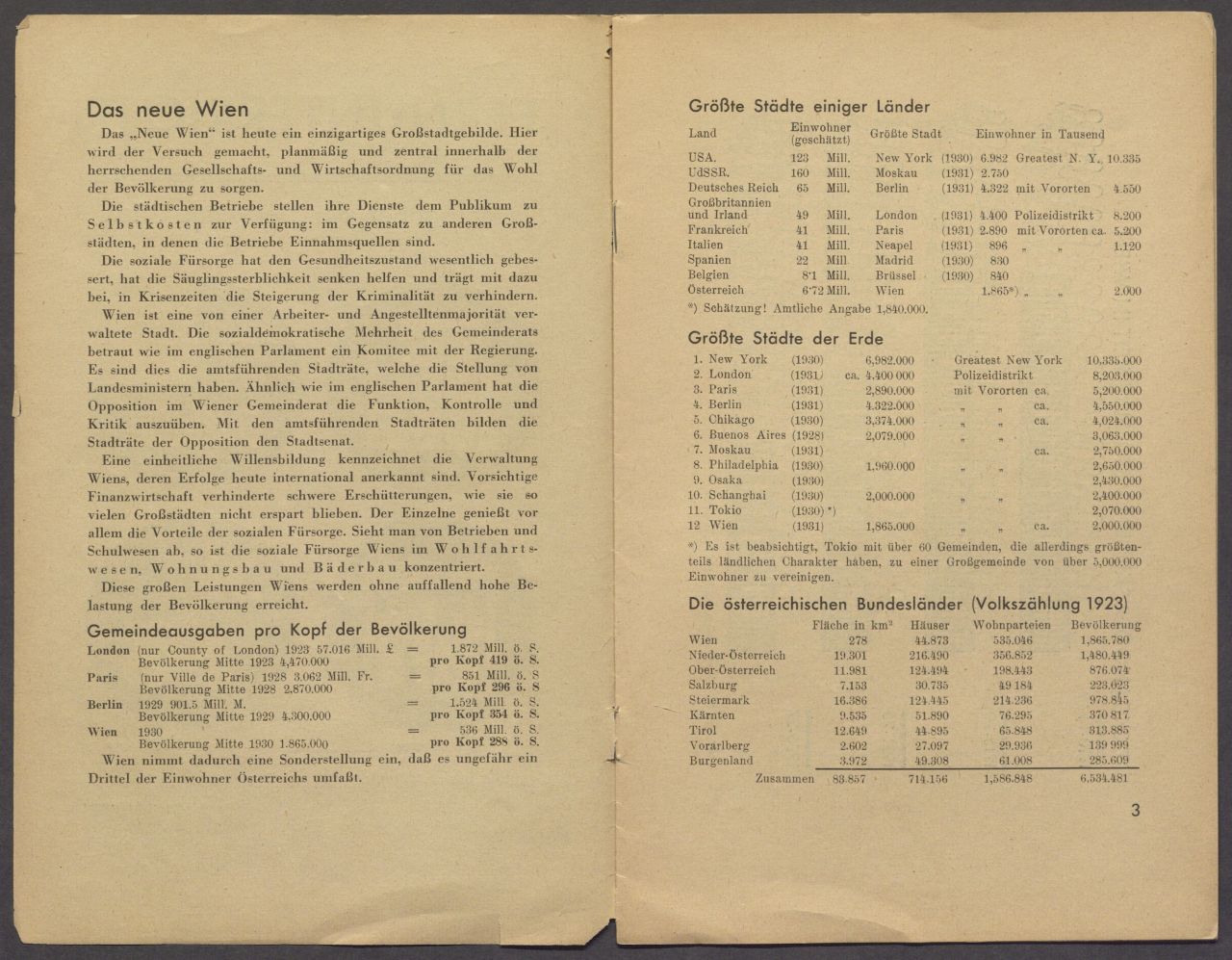 Das neue Wien / Gemeindeausgaben pro Kopf der Bevölkerung / Größte Städte einiger Länder / Größte Städte der Erde /