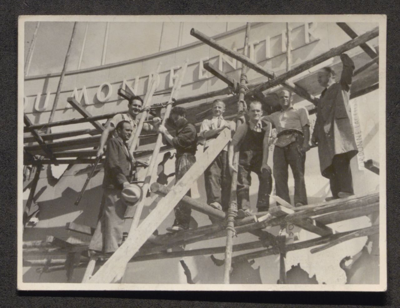 Arbeiter beim Aufbau der Schauwand |